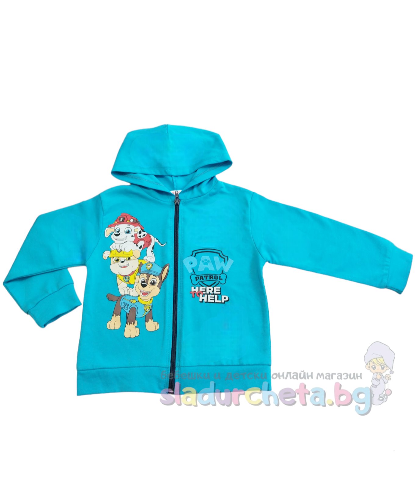 Суитшъртът е с качулка и с дълъг ръкав в син цвят с апликация на Пес Патрул;
