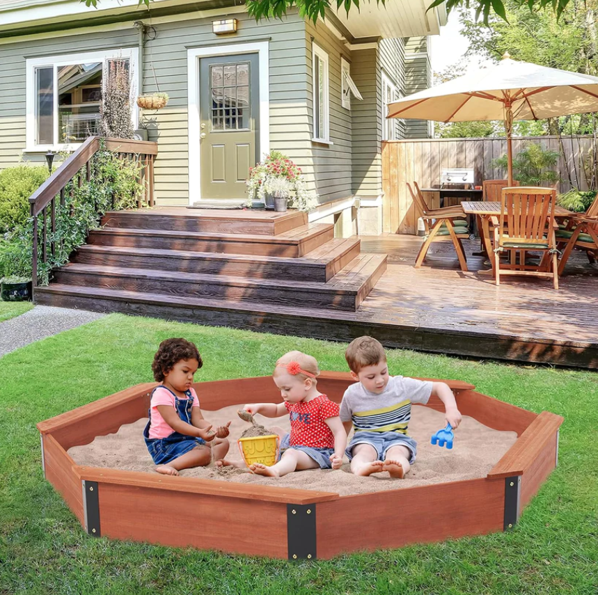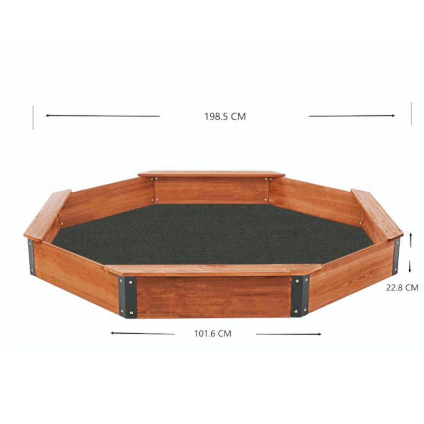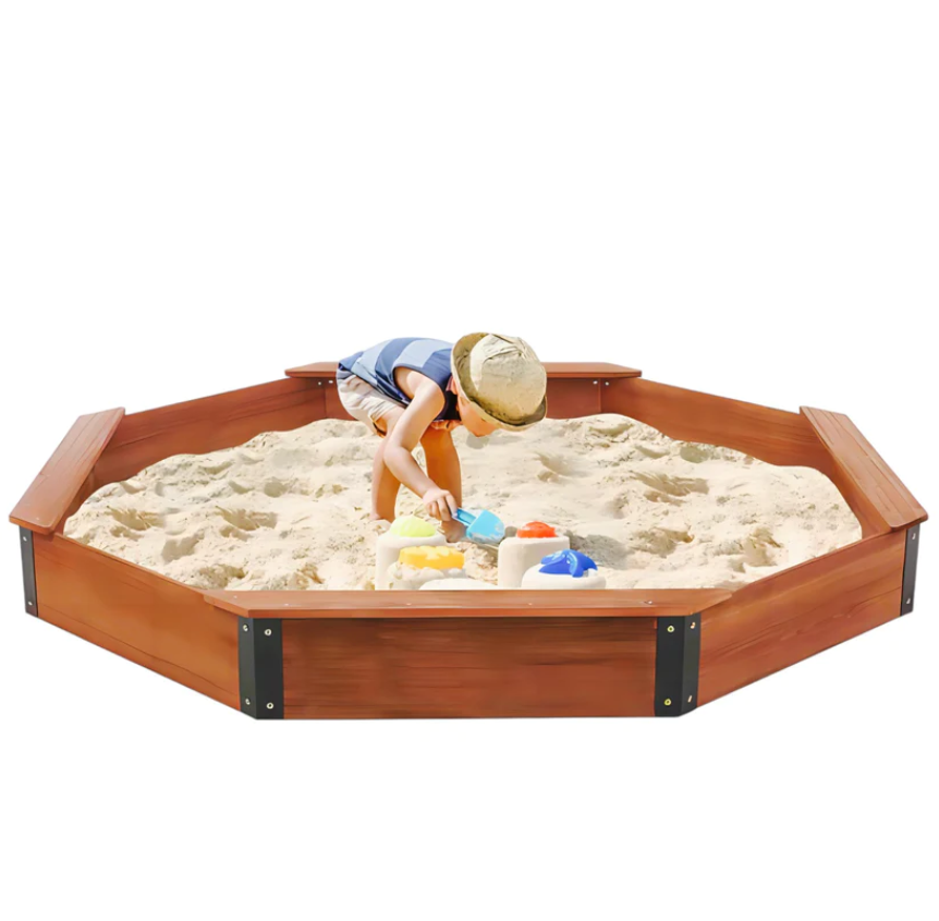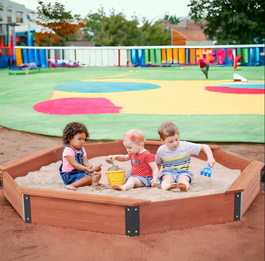 Дървен осмоъгълен пясъчник, който е проектиран за издръжливост, стабилност и безопасност, със здрави дървени панели, свързани с метални стълбове, за да издържат на атмосферни условия на открито и на груба игра;