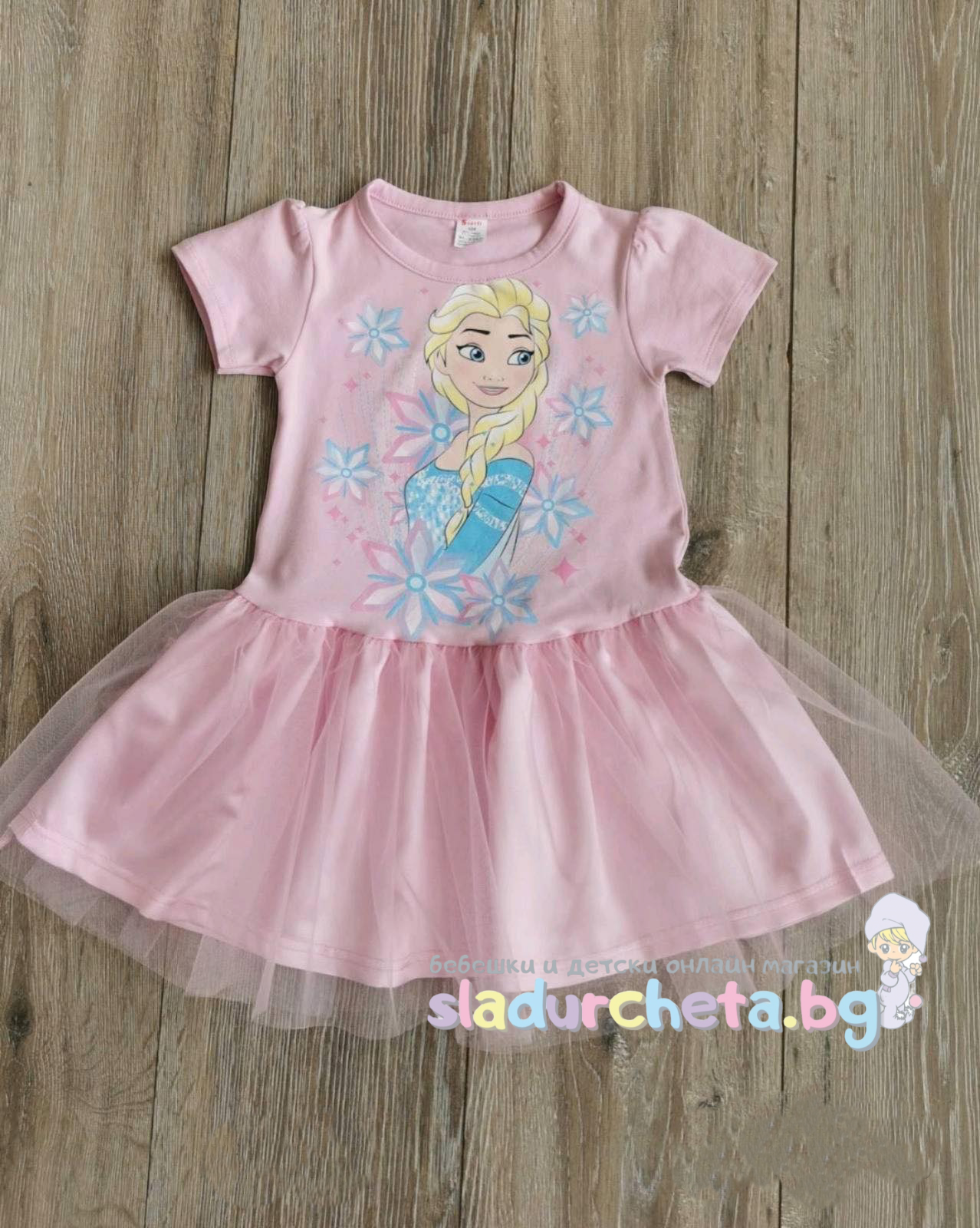 Роклята е с къс ръкав в розов цвят с апликация на Елза;
