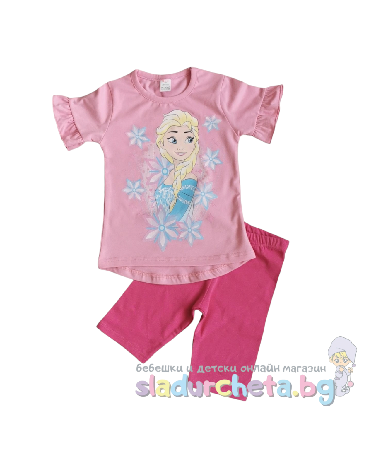 Тениската е с къси къдрави ръкави в розов цвят с апликация на Елза;