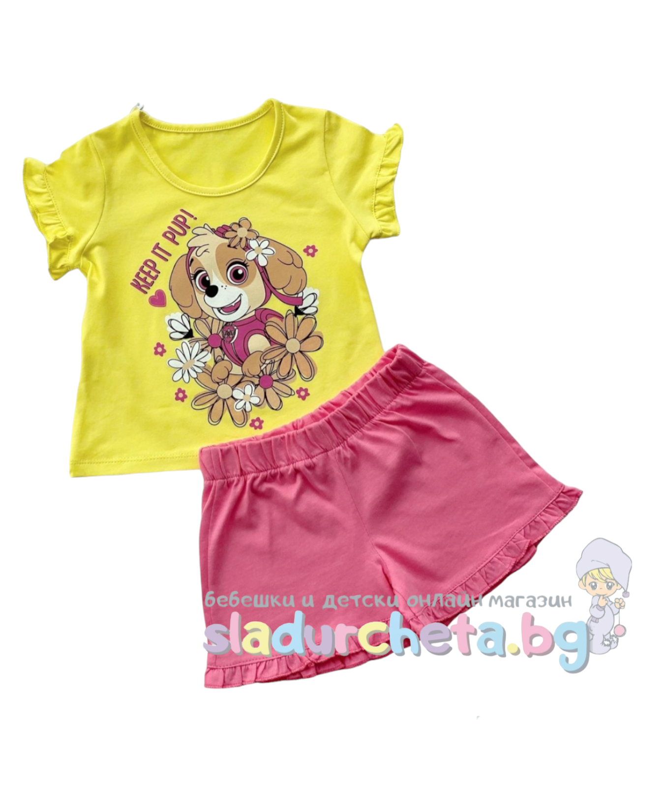 Тениската е с къси къдрави ръкави в жълт цвят с апликация на Скай от Пес Патрул;