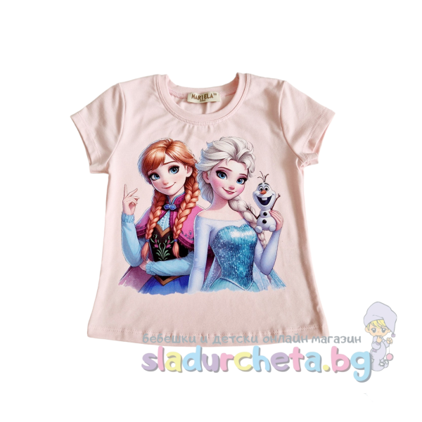 Тениската е с къс ръкав в цвят пудра с апликация на Елза и Анна;