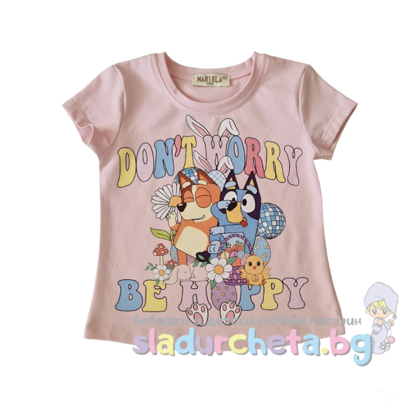 Тениската е с къс ръкав в цвят пудра с апликация на Блуи;