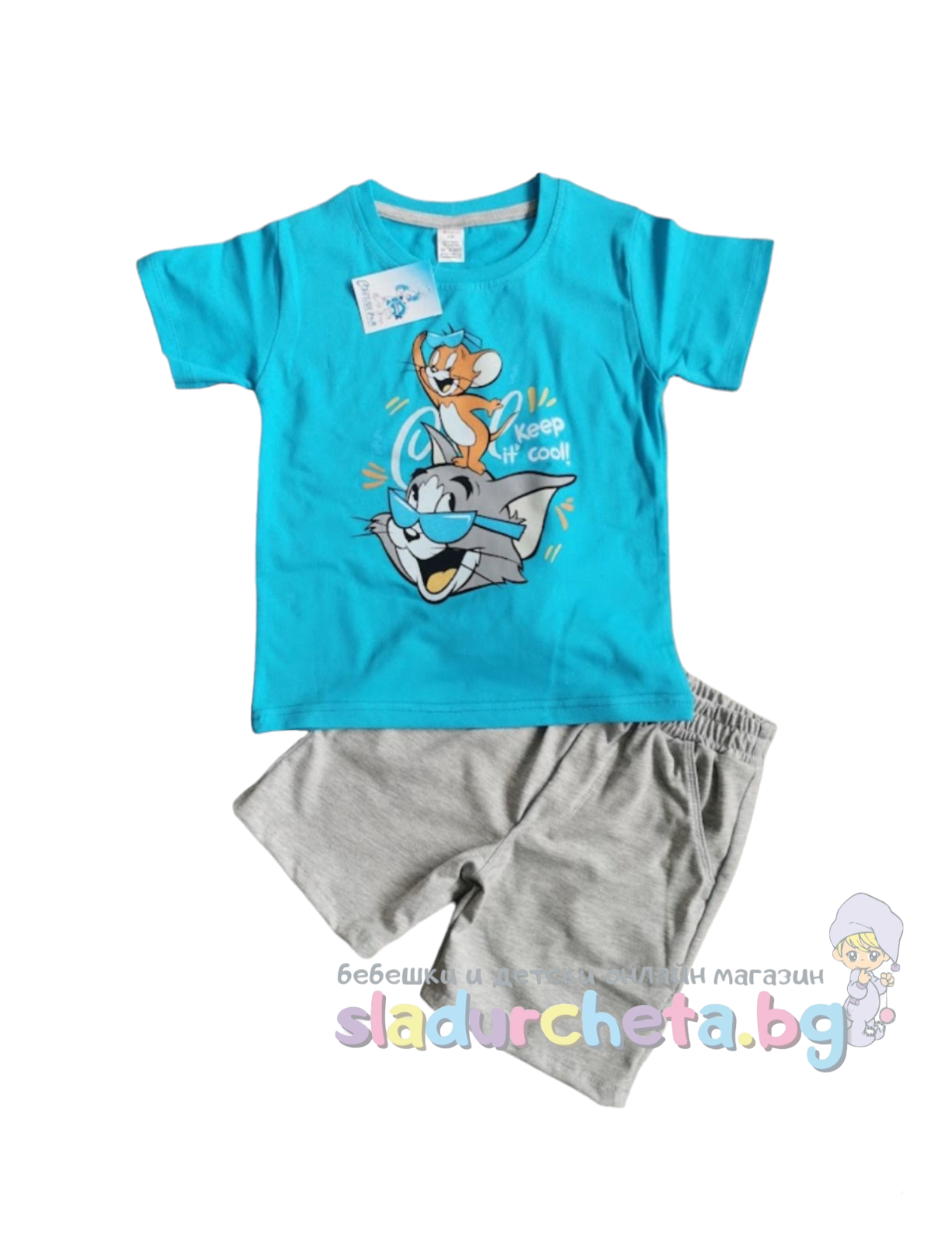 Тениската е с къс ръкав в син цвят с апликация на Том и Джери;