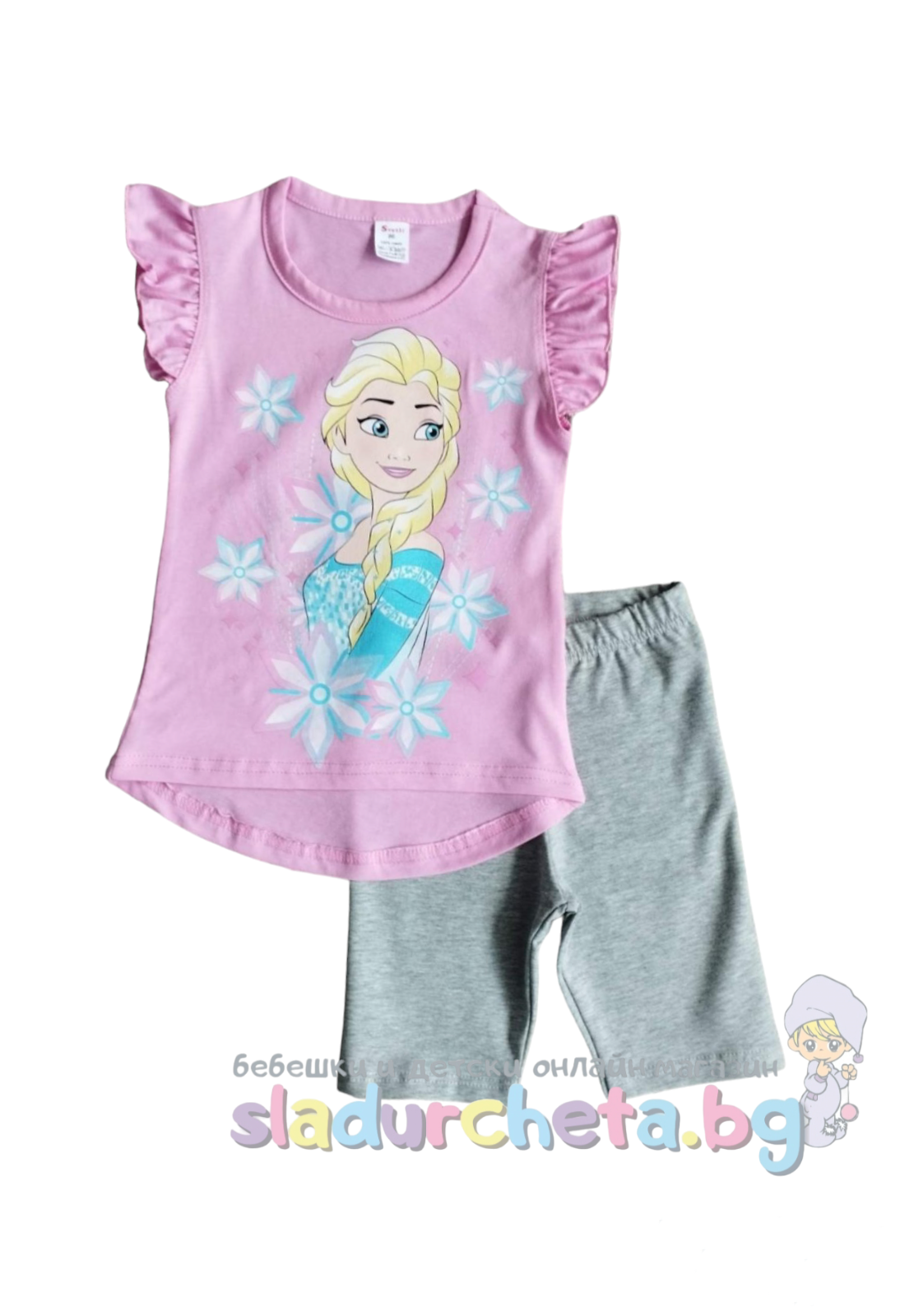 Потникът е с къдрави ръкави в розов цвят с апликация на Елза;