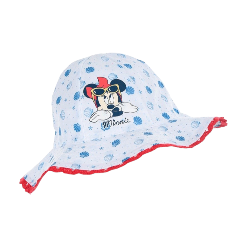 Шамката е в бял цвят с цялостен принт на миди, с червен кант и апликация на Мини Маус;