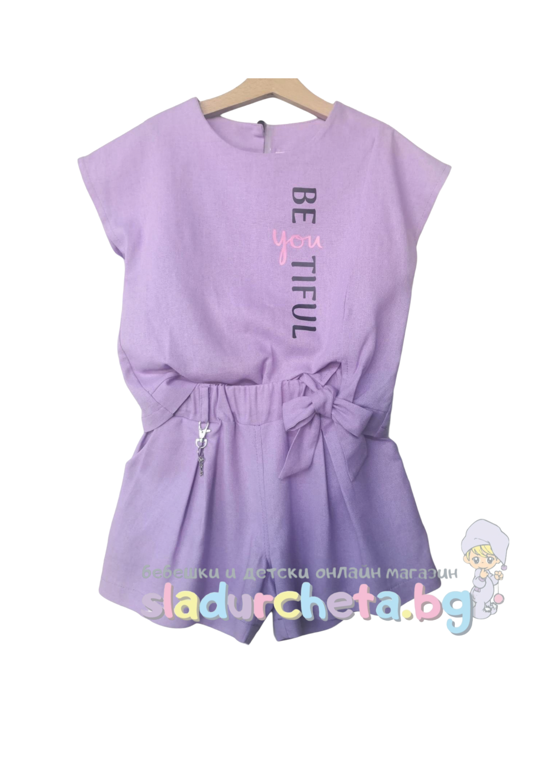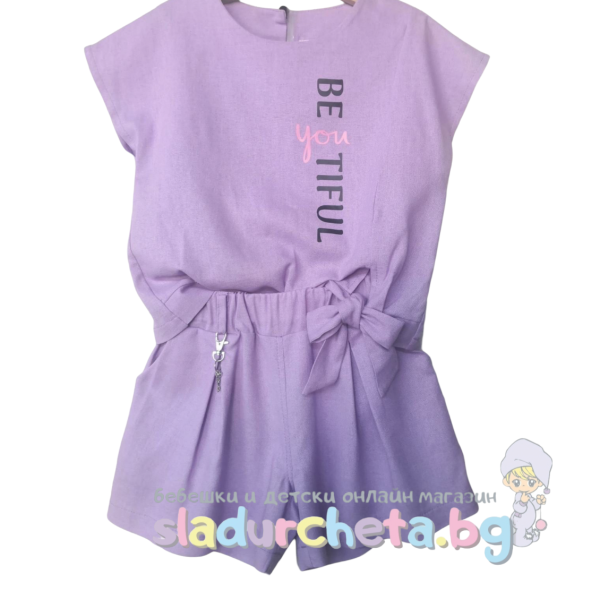 Късите панталони са с два джоба и коланче в лилав цвят;