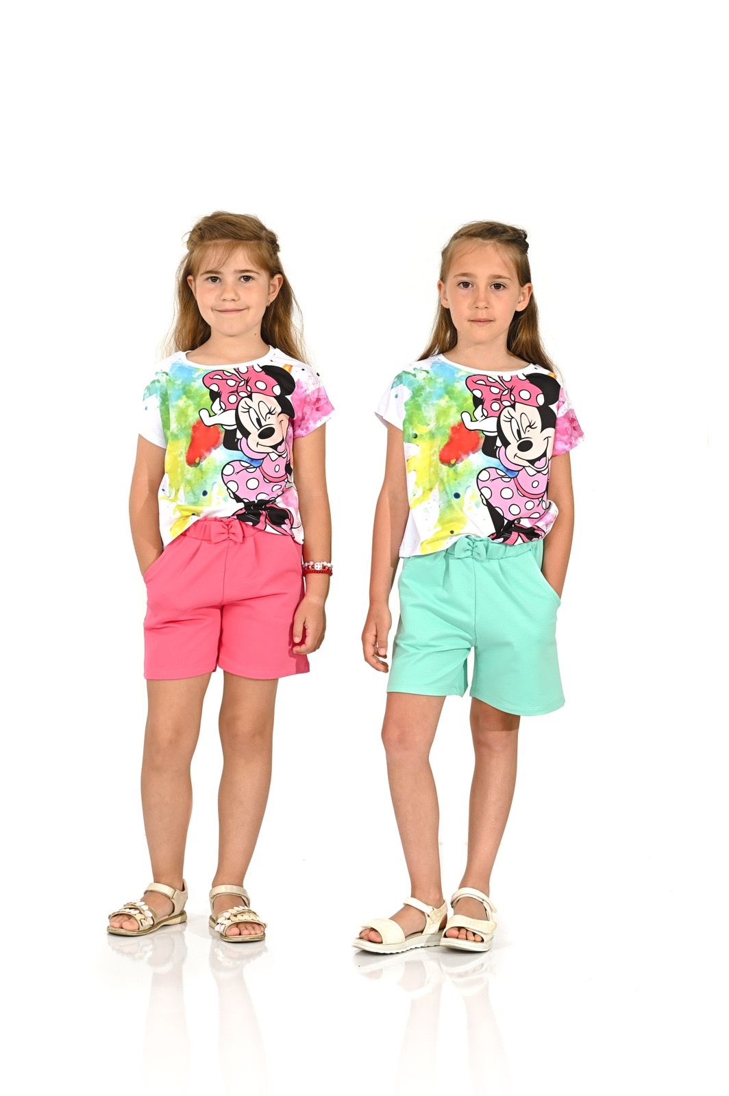 Късите панталони са с два джоба и се предлагат в два цвята: тъмно розови и в цвят мента с панделка и ластична част на талията;