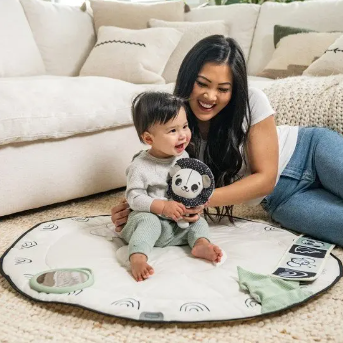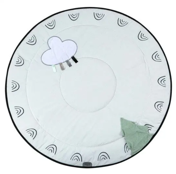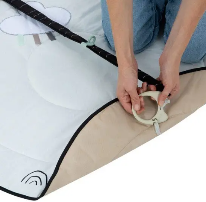 Плюшеният облак и цветните сатенени панделки на подложката запознават детето с различни текстури и развиват фината моторика;