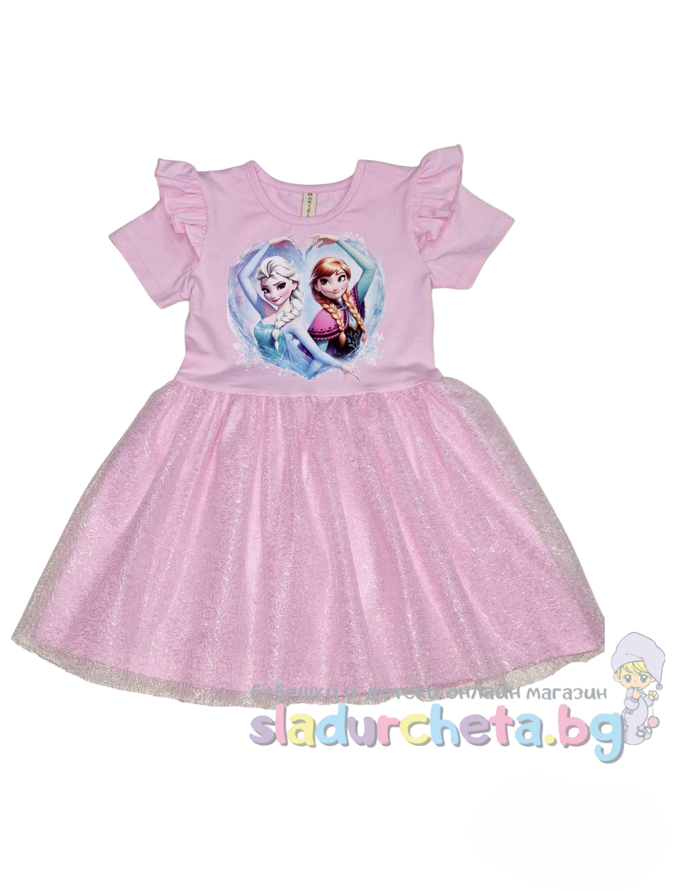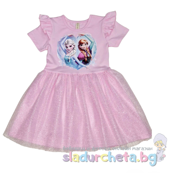 Роклята е с къс ръкав в розов цвят, с паликация на Елза и Анна и къдрави акценти на ръкавите;