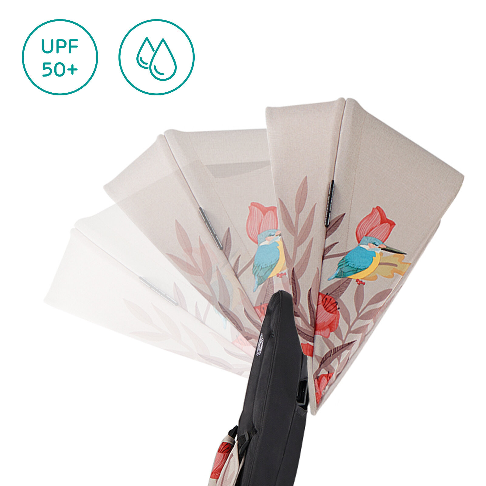 • Широк водоустойчив сенник от UPF 50+ плат, който може да се пере в пералня;