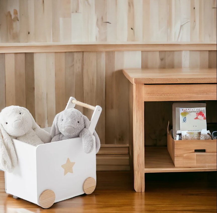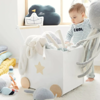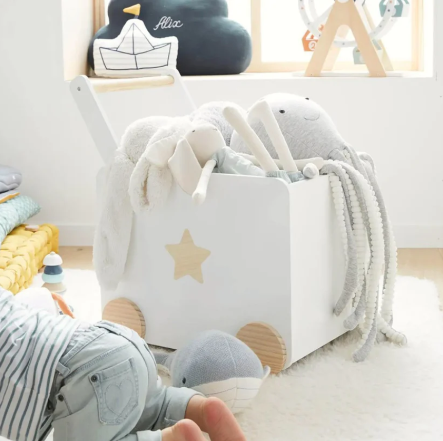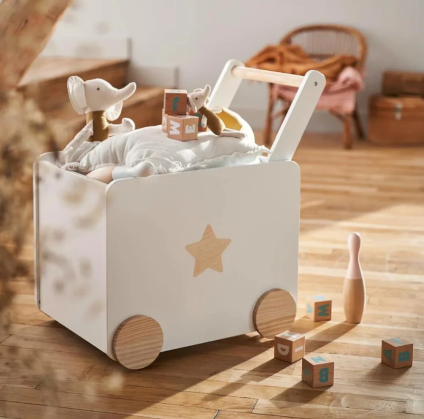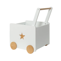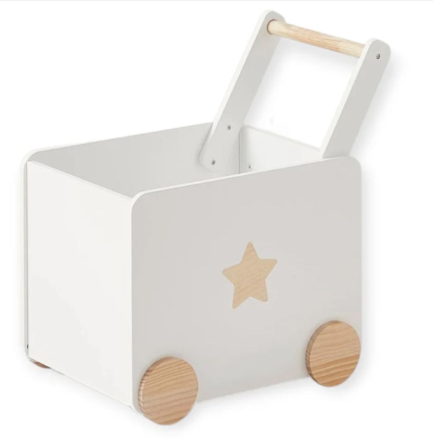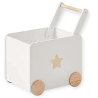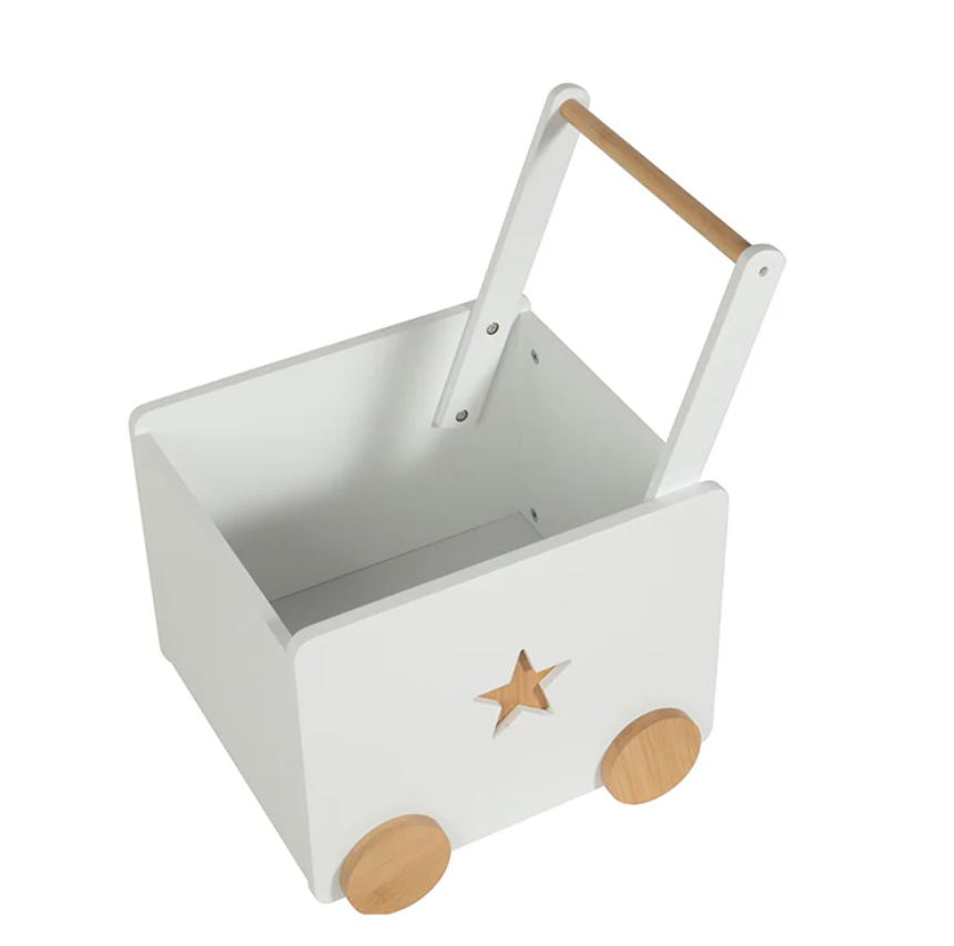 • Кутията за съхранение на играчки с колелца и дръжка за бутане;