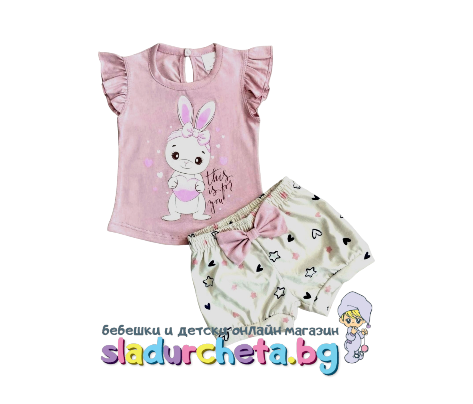 Късите панталони са в бял цвят с щампи на сърца и звезди и панделка на талията;
