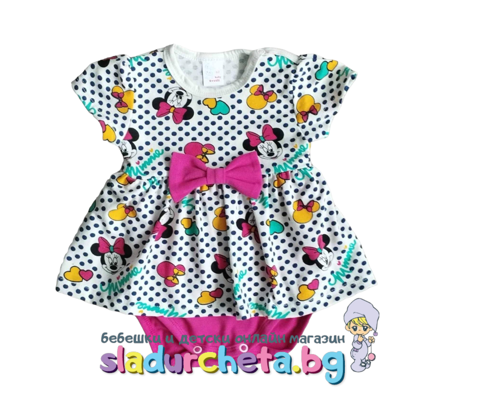 Роклята е с къс ръкав в бял цвят на точки с щампа на Мини Маус и панделка на талията;