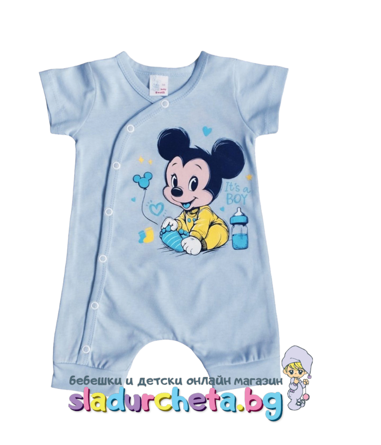 Гащеризонът е с къс ръкав в син цвят с апликация на Мики Маус;