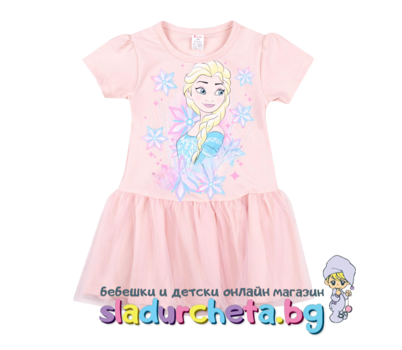 Роклята е с къс ръкав в розов цвят с апликация на Елза;