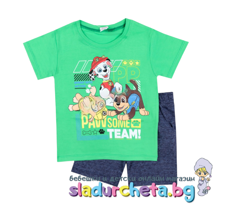Тениската е с къс ръкав в зелен цвят с апликация на Пес Патрул;