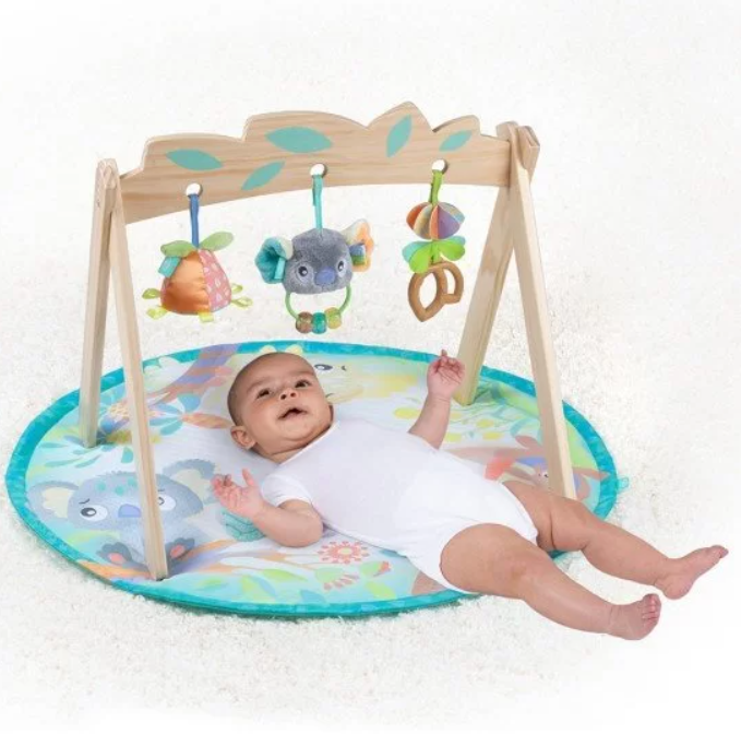 • Три висящи играчки и разнообразни текстури за сетивно развитие;