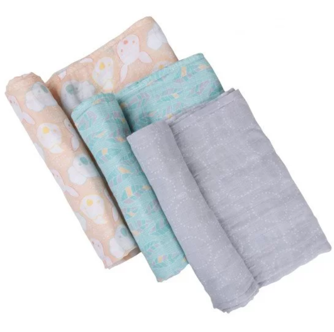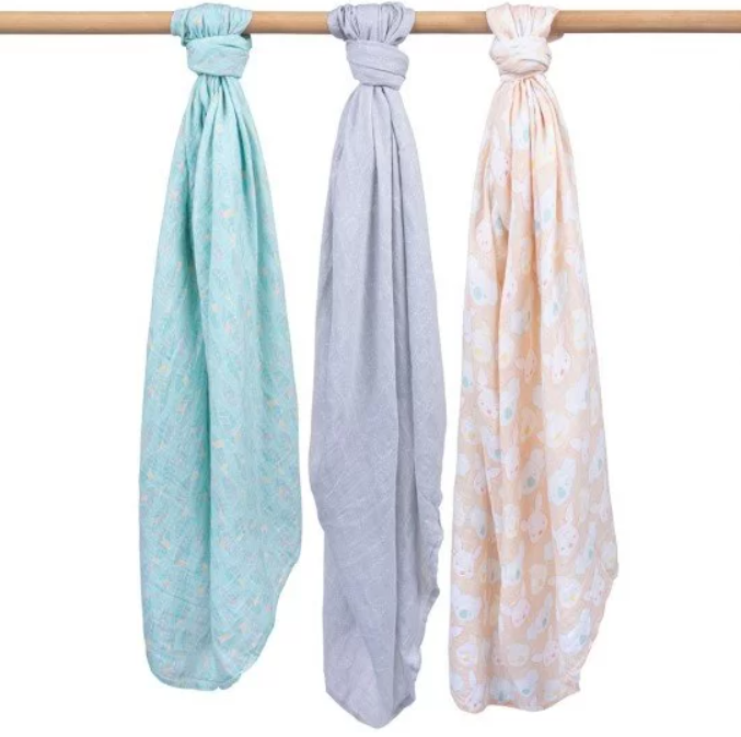 Комплект от 3 броя пелени с различни модерни десени в нежни пастелни цветове;