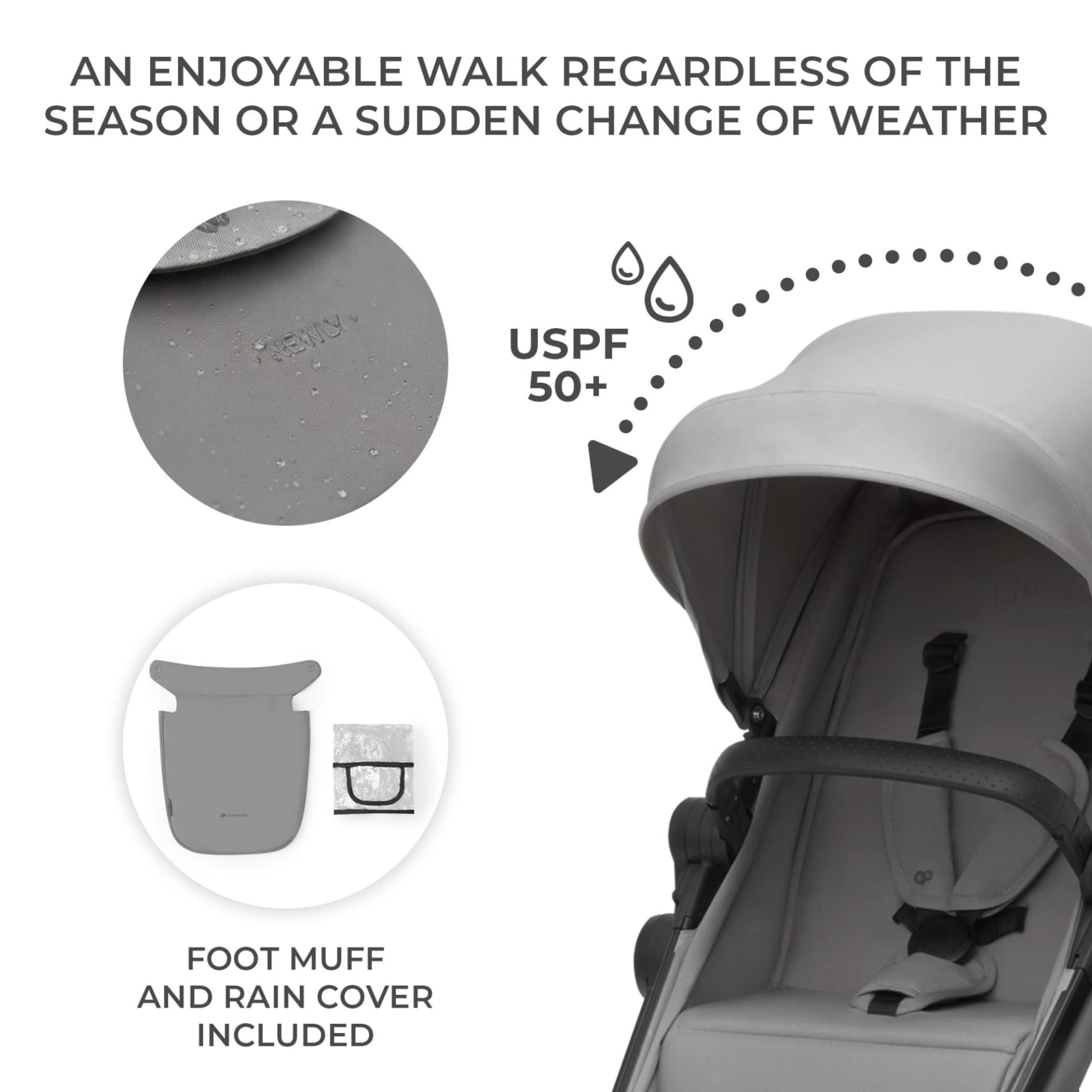 • Голям, водоустойчив сенник, изработен от плат с фактор UPF50+ с допълнително удължение и прозорец;