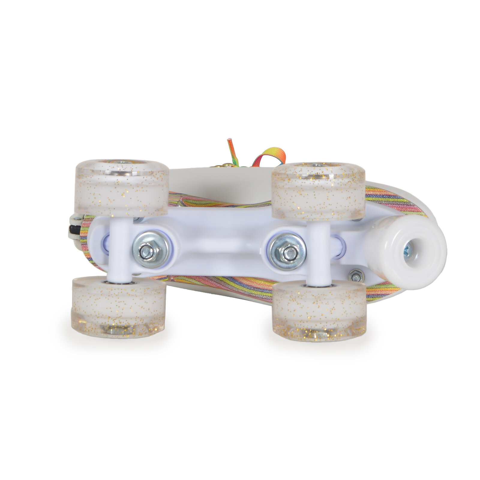 • Регулируеми кънки с PU прозрачни брокатени колелца;