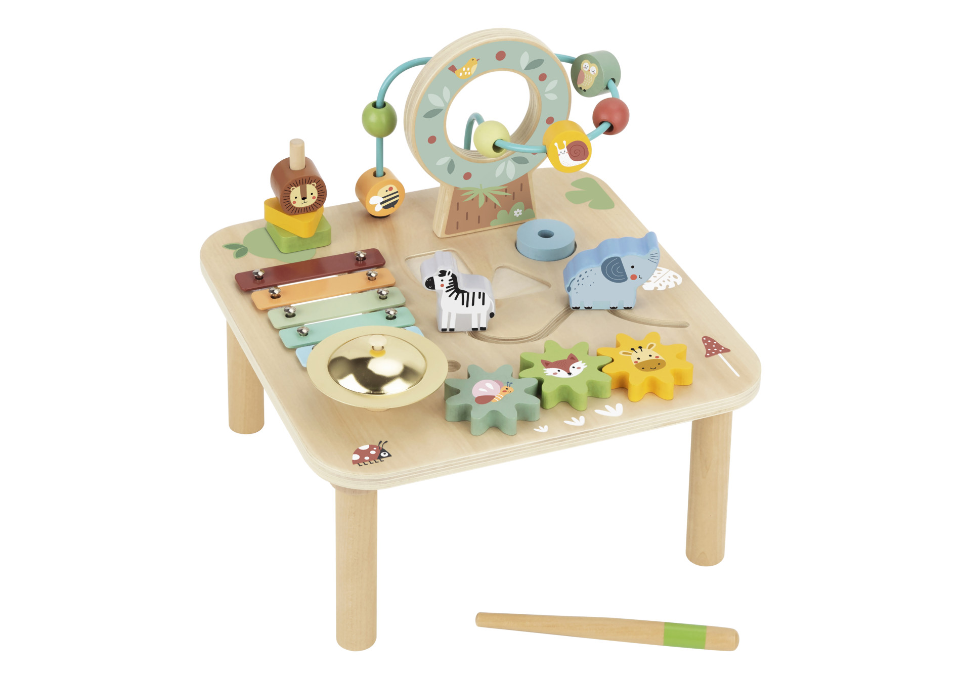 Масата включва различни активности, като лабиринти, музикален център с ксилофон, различни форми за нанизване и поставяне на правилното място, система с 3 колелца за координация и други;