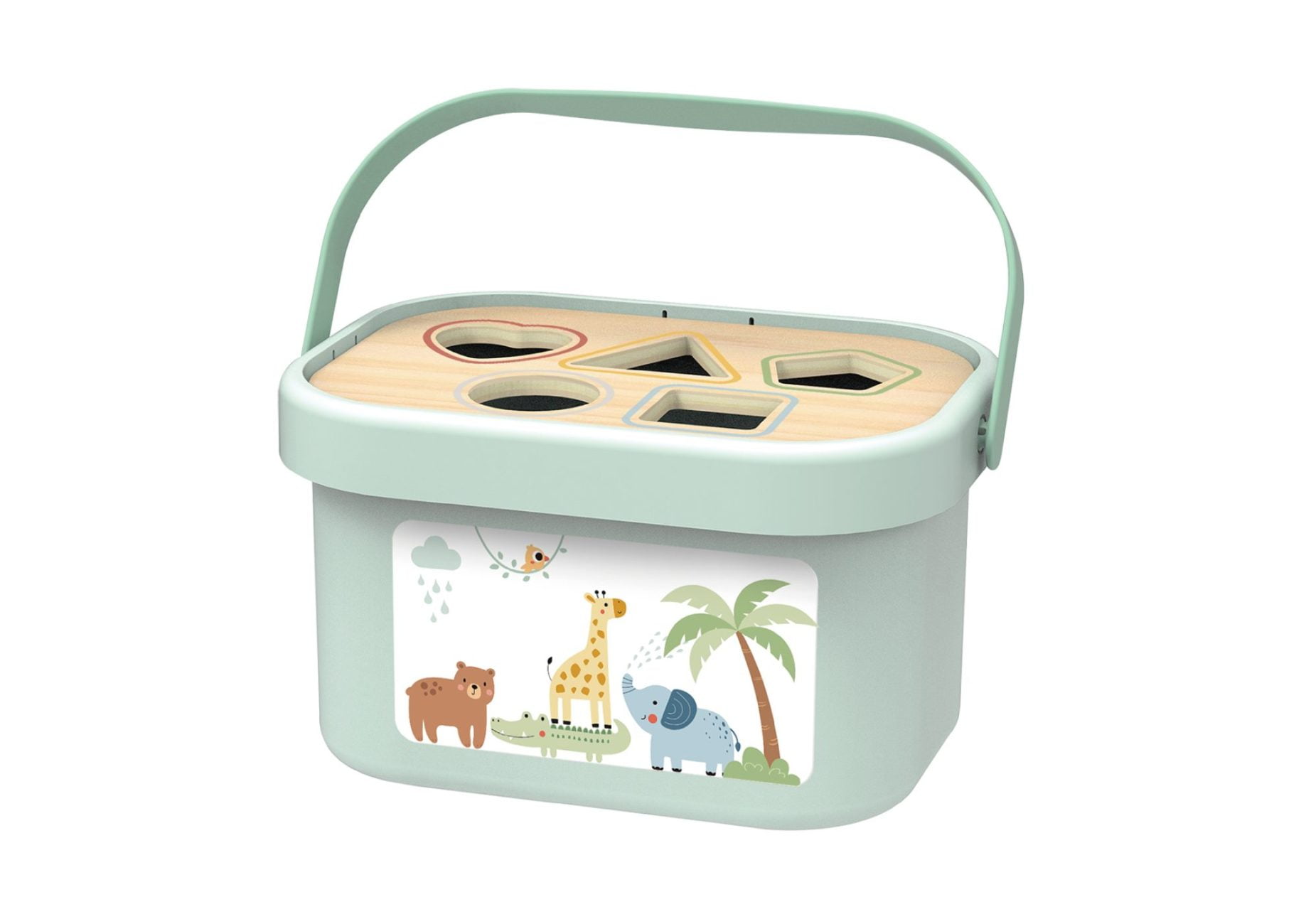 Кутията има капак през които малкото дете да пуска различните форми;