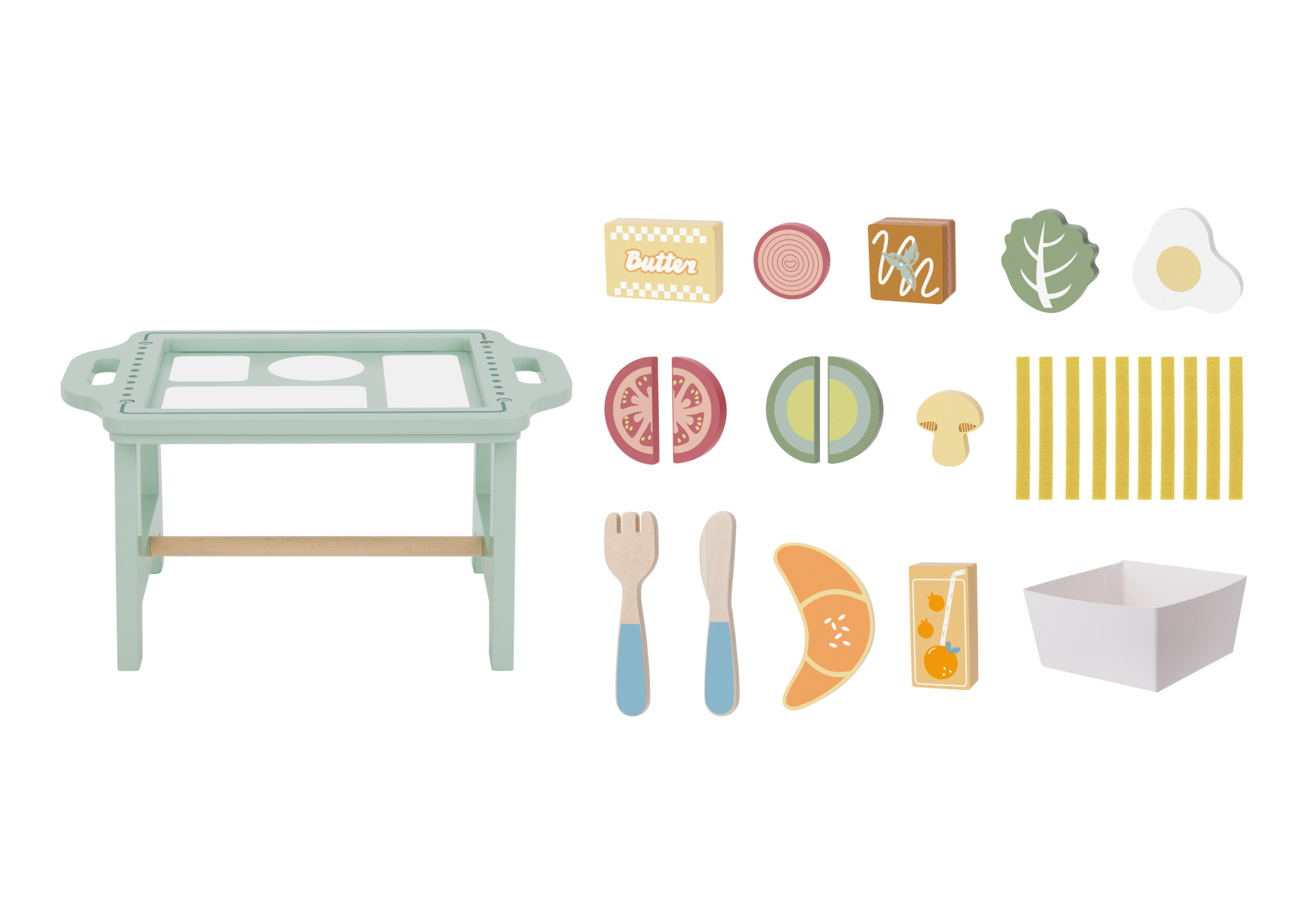 В комплекта са включени дървен поднос на стойка, меню, вилица и нож, и всичко необходимо за една богата закуска;