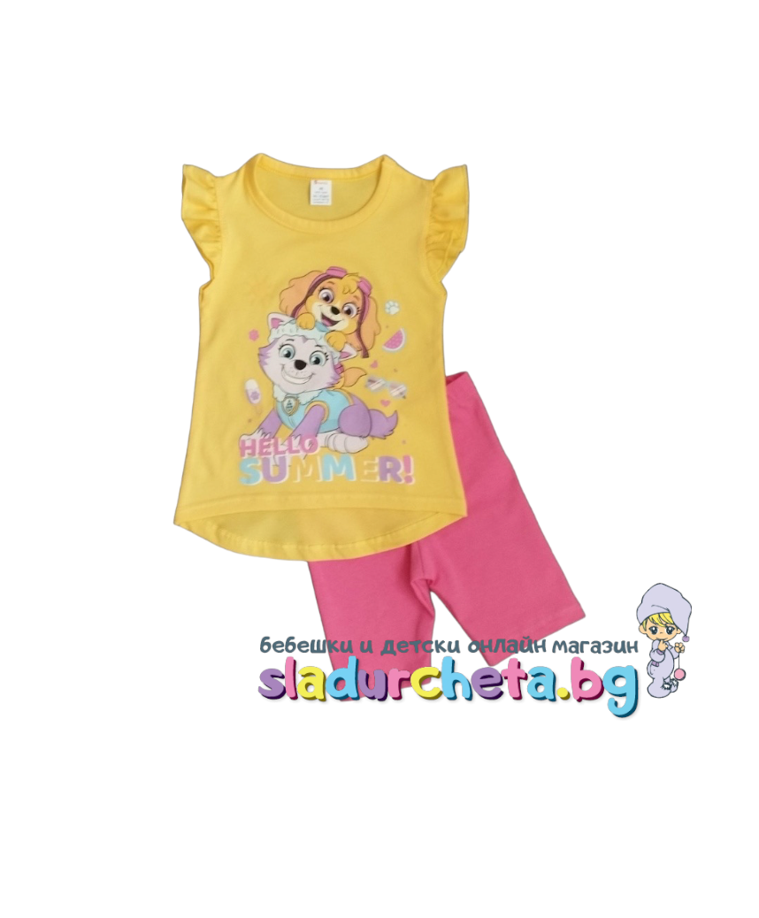 Тениската е с къдрави ръкави в жълт цвят с апликация на герои от Пес Патрул;