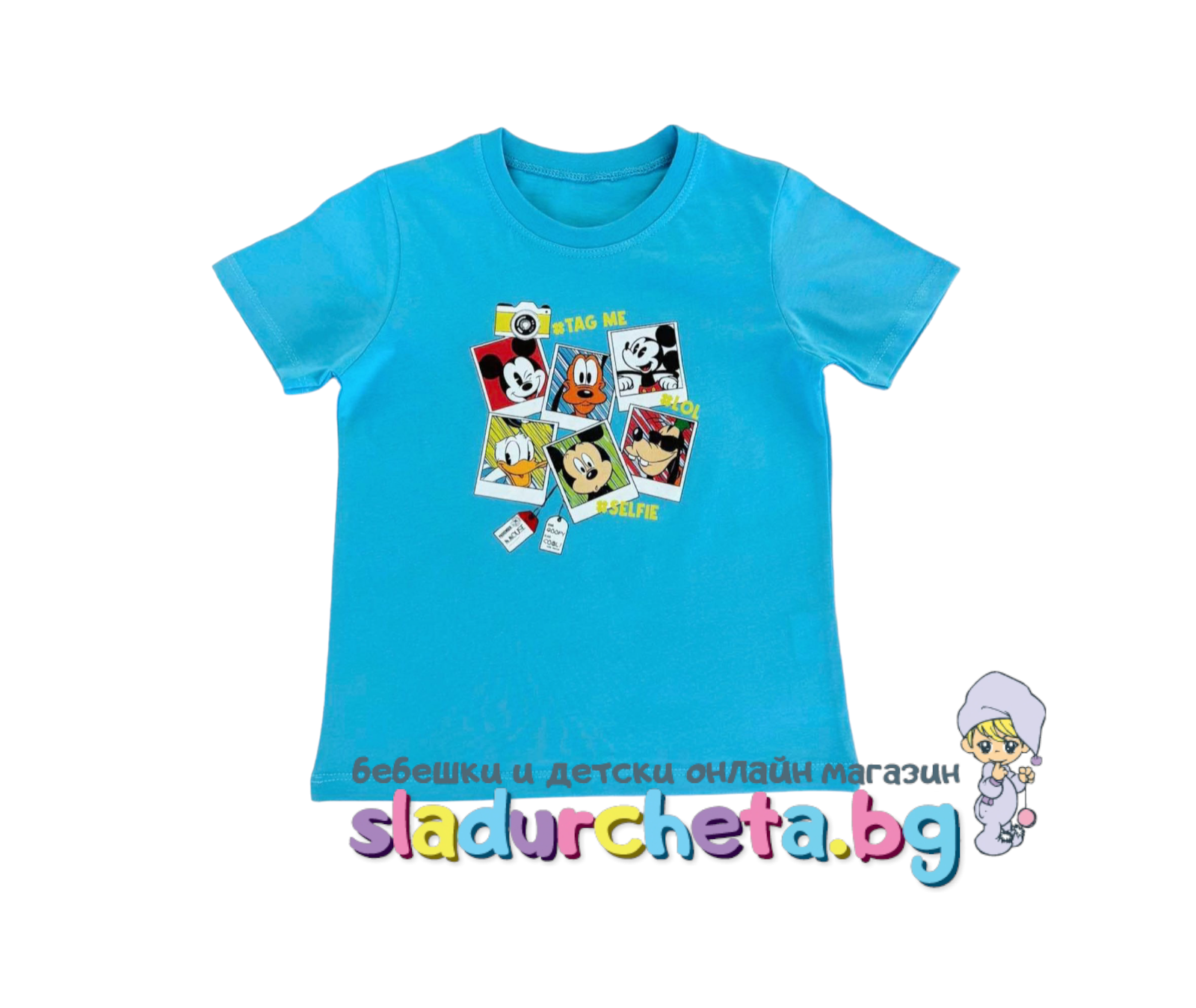 Тениската е с къс ръкав в син цвят с малки цветни снимки;
