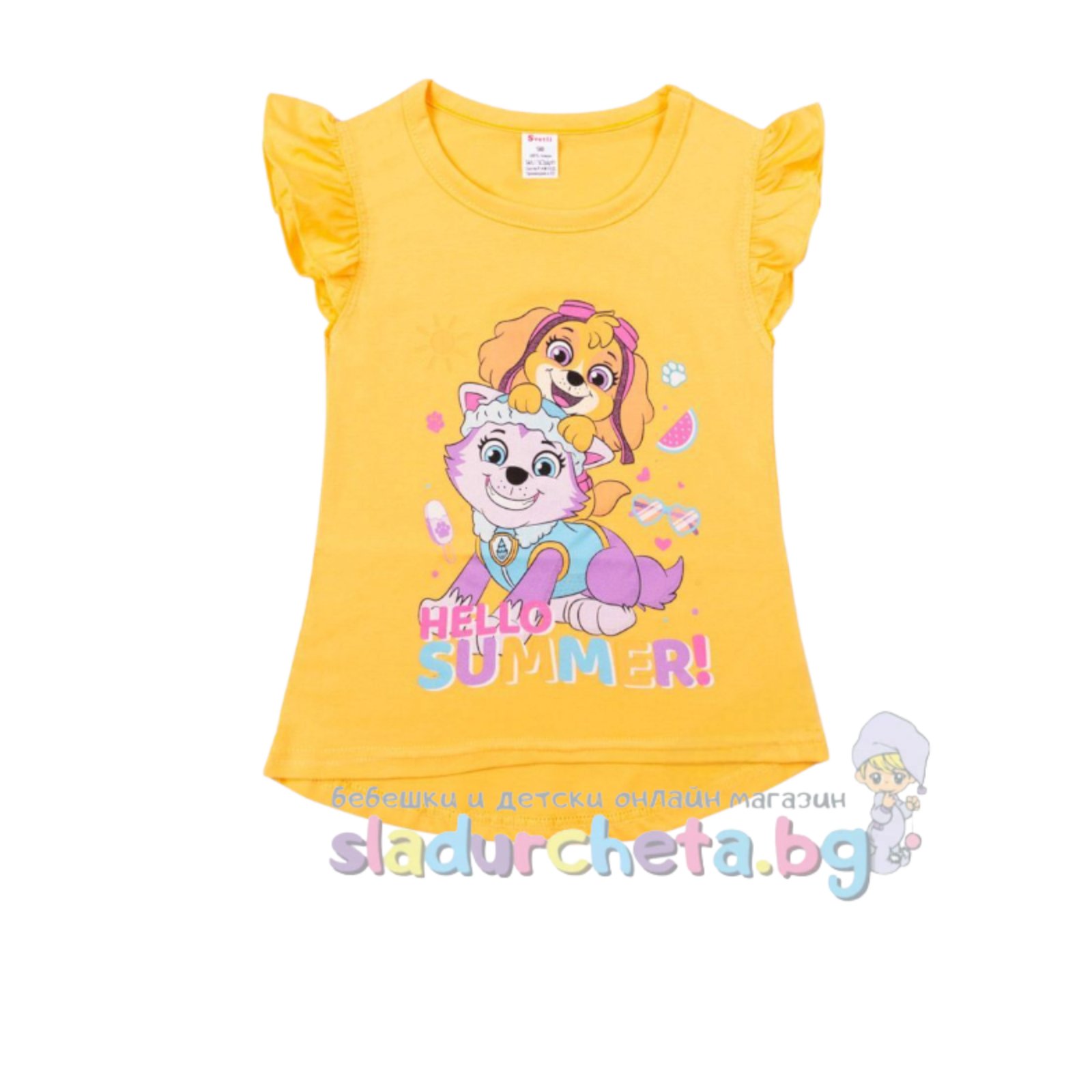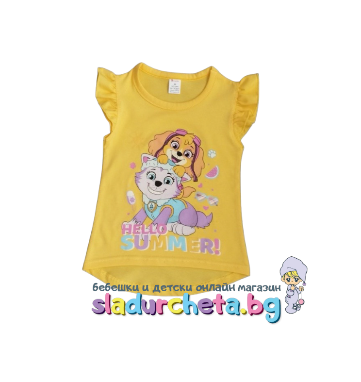 Тениската е с къси къдрави ръкави в жълт цвят с апликация на герои от Пес Патрул;