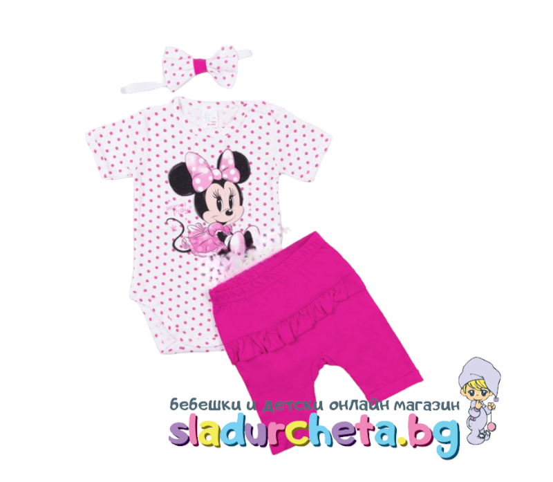 Бодито е бяло на розови точки с апликация на Мини Маус;