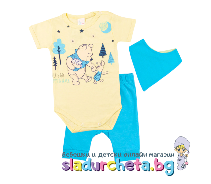 Бебешки и детски магазин "СЛАДУРЧЕТА" и марката "Светли" представят на Вашето внимание бебешки комплект от три части със следните характеристики: