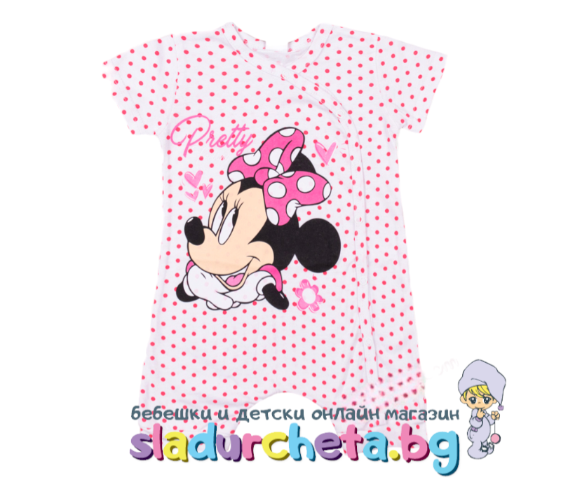 Гащеризонът е с къс ръкав в бял цвят на розови точки с апликация на Мини Маус;