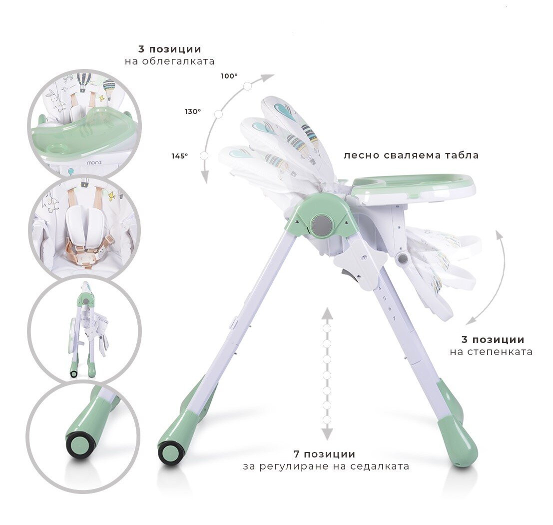 Бебешки и детски магазин "СЛАДУРЧЕТА" и марката "Moni" представят на Вашето внимание детски стол за хранене със следните характеристики: