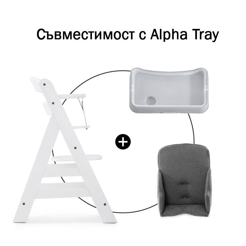 Може да се използва с 5-точковите колани или предпазната каишка на столчетата за хранене, както и с таблата за хранене Alpha Tray;