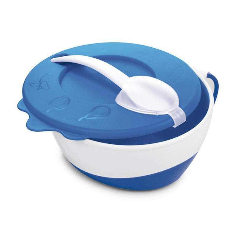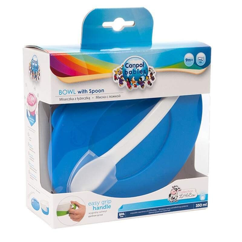 Купа за хранене с капаче и лъжица Canpol Little Cow 9м+ 350 мл, синьо