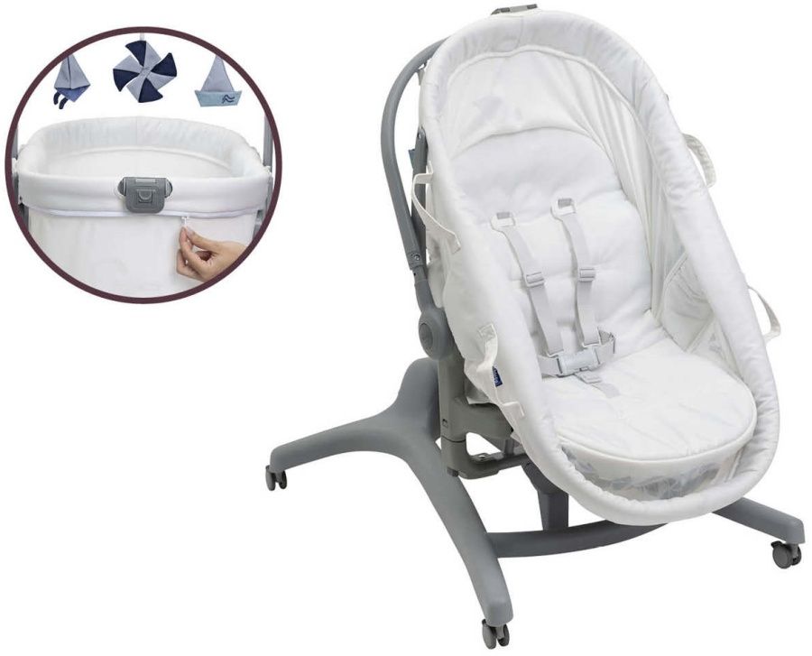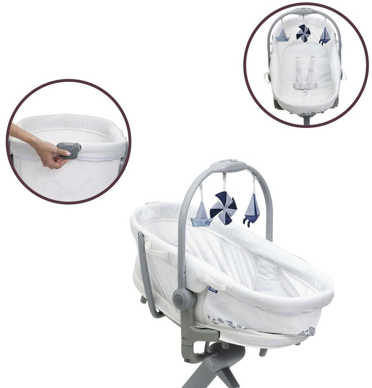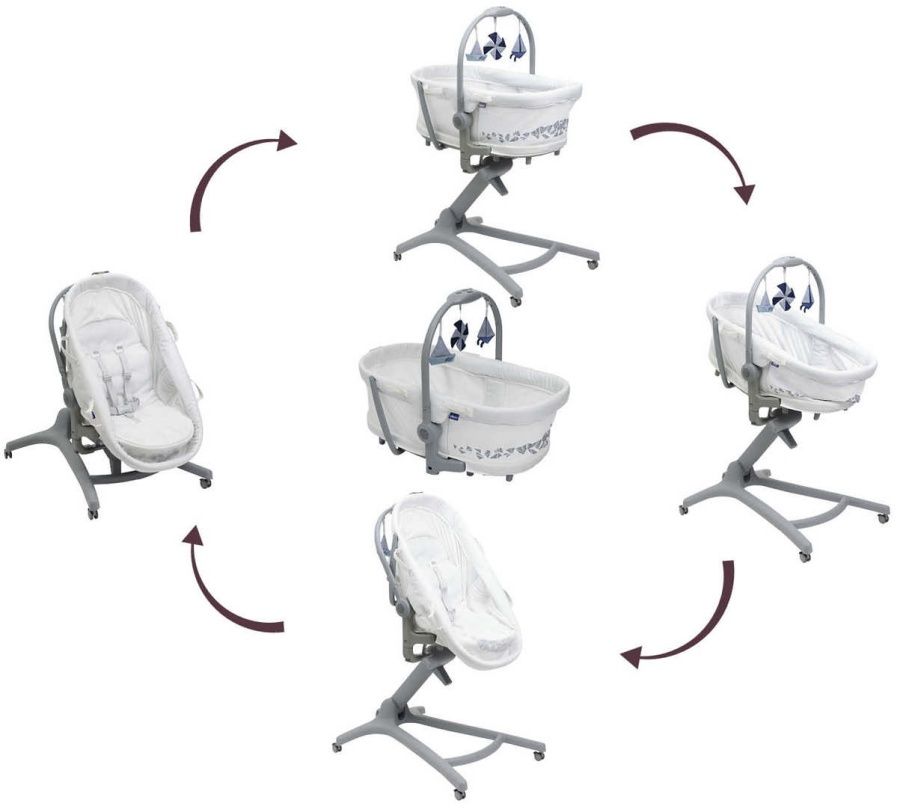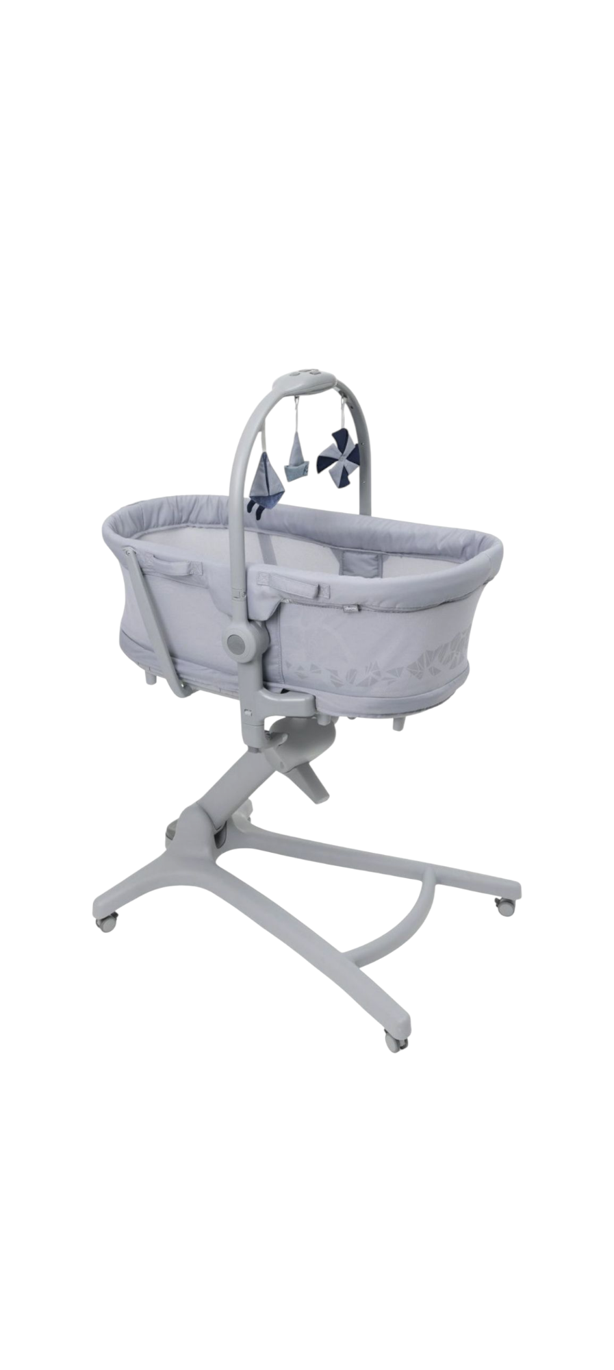 • 5 функции в едно: кош за новородено, самостоятелно стоящ кош, шезлонг, столче за хранене и първо столче;
