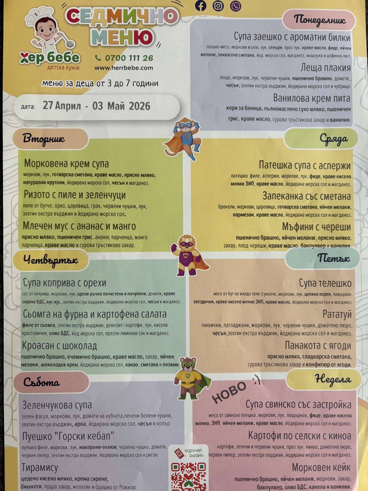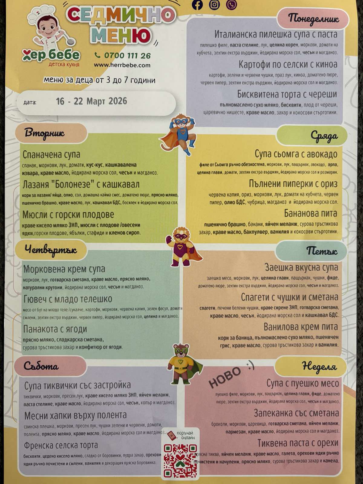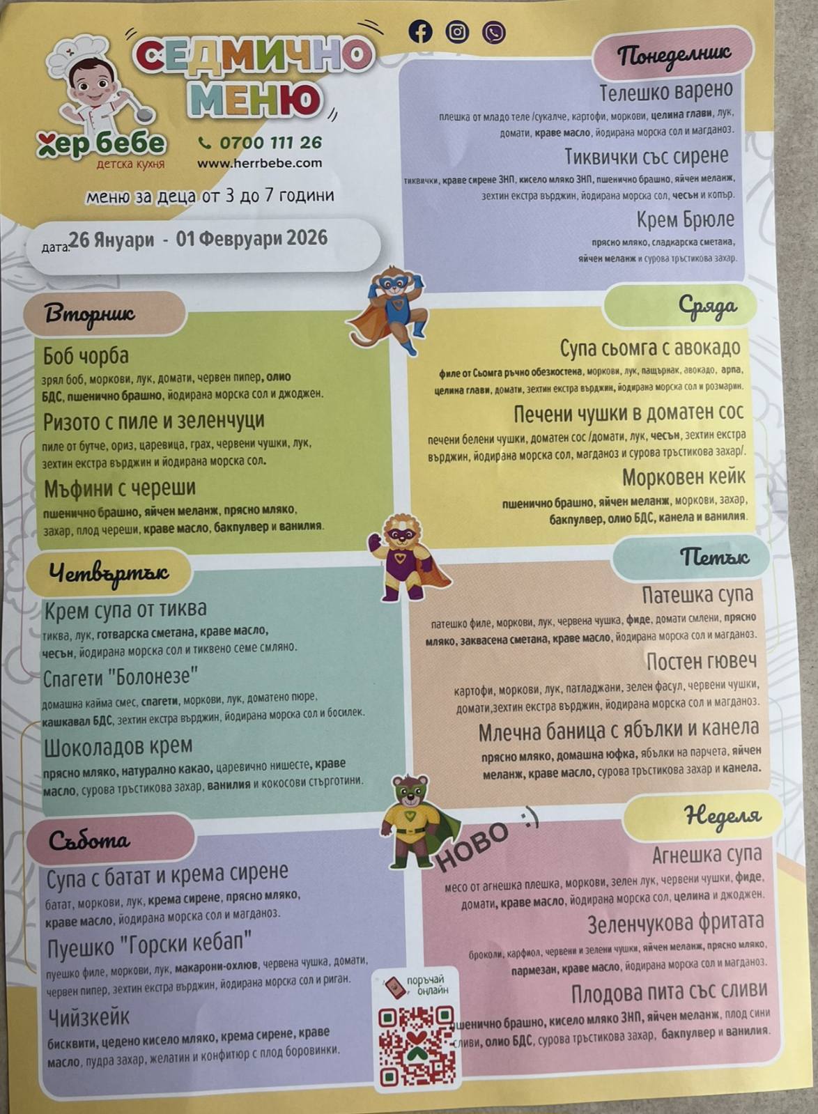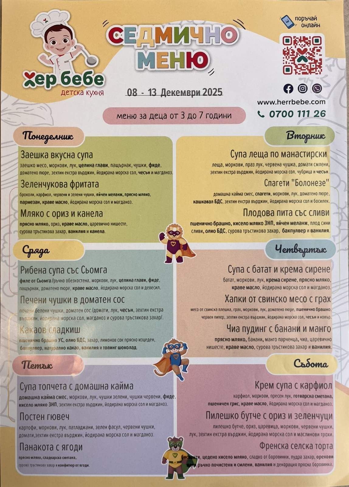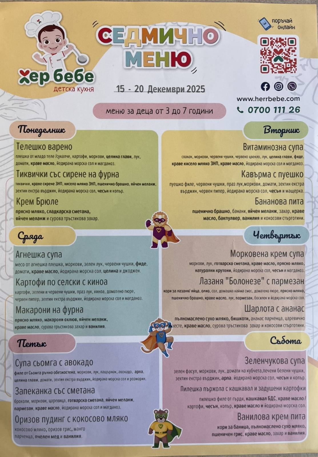 Менютата са съобразени изцяло с хранителния режим на децата Ви и техните калорийни нужди.