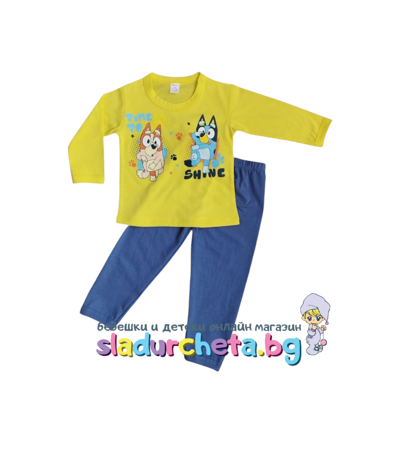 Блузата е с дълъг ръкав в жълт цвят с апликация на Блуи;