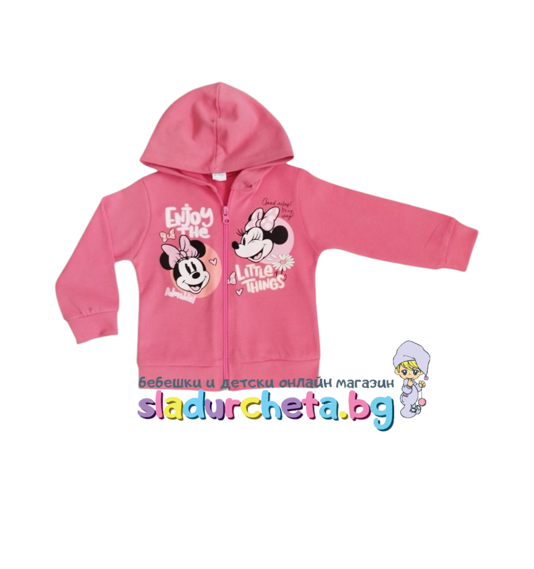 Суитшъртът е с качулка и с дълъг ръкав в розов цвят с апликация на Мини Маус;