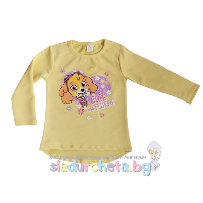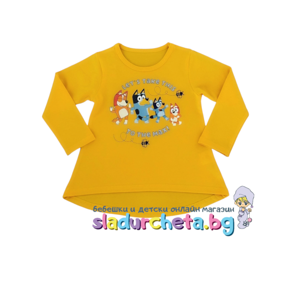 Блузата е с дълъг ръкав в жълт цвят с цветна апликация на Блуи;