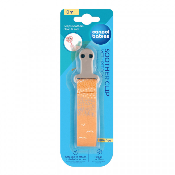 Клипсът за залъгалка Canpol с лента е безопасен и издръжлив;