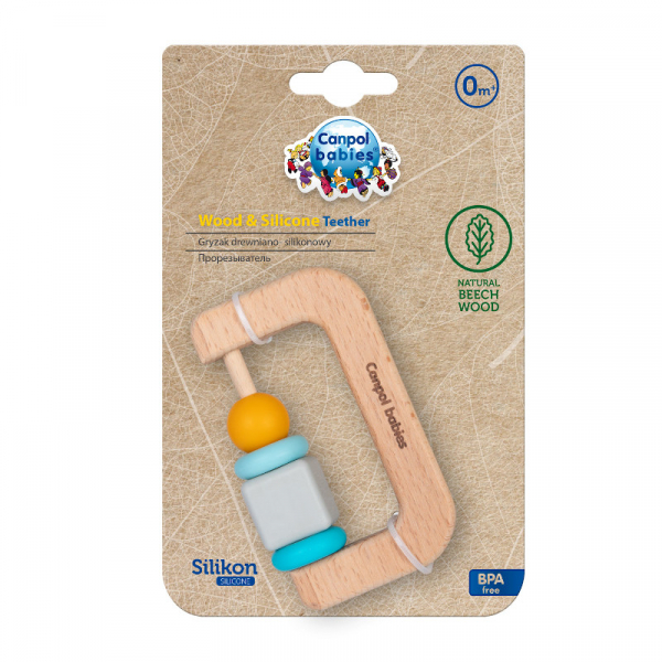 Дървената чесалка със силиконови елементи е идеалната първа играчка за бебето, както и незаменима помощ в трудния период на никнене на зъбки при най-малките;