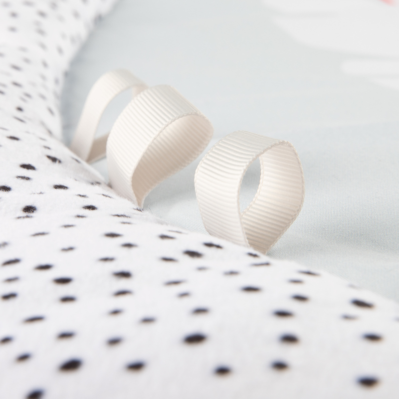 Играчките могат да се отделят и да се дават за игра самостоятелно: 2 лица на животинки- дрънкалки, 2 шумолящи листа с огледало, заобиколени от цветни лентички, чесалка;