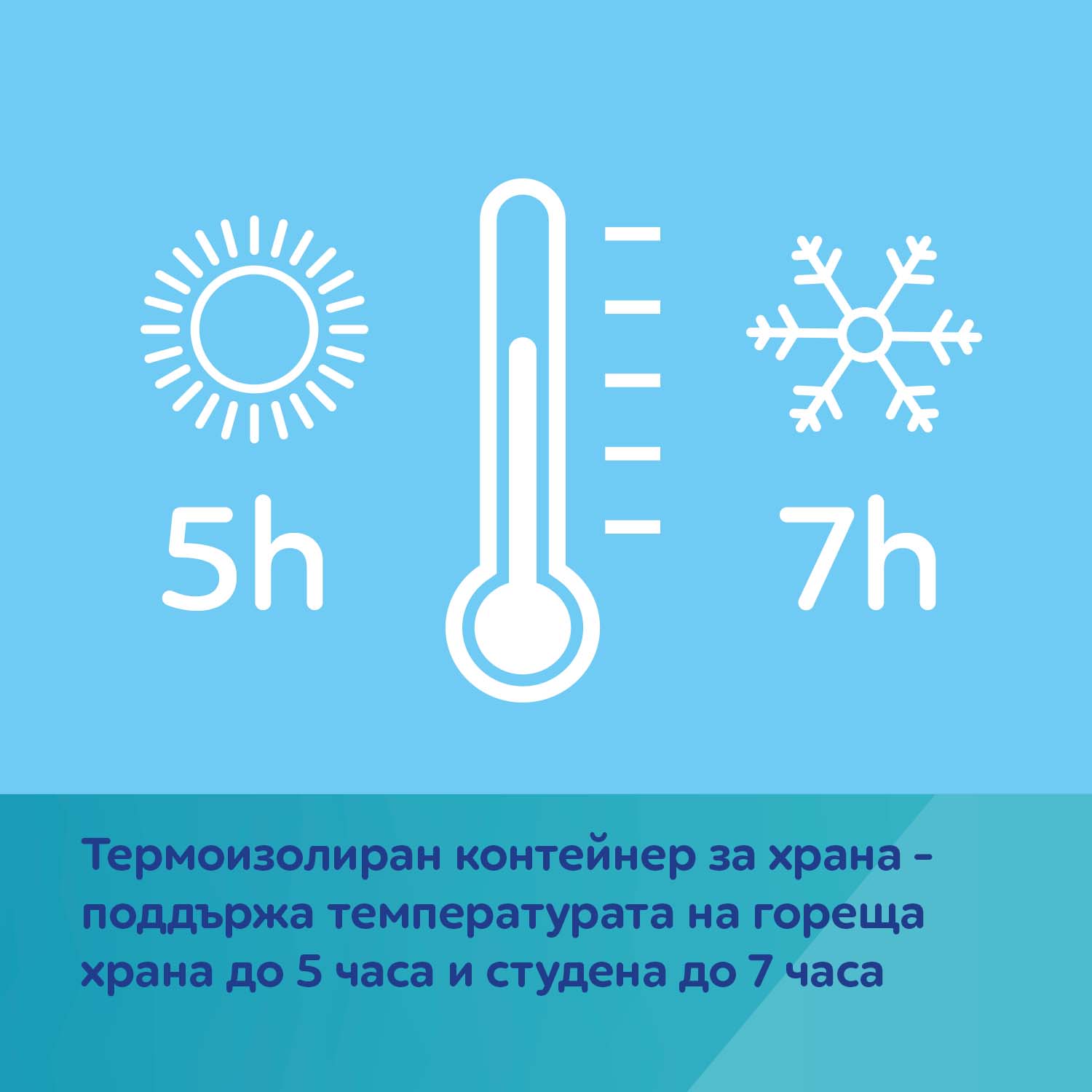Поддържа температурата на горещи храни до 5 часа и студени до 7 часа;
