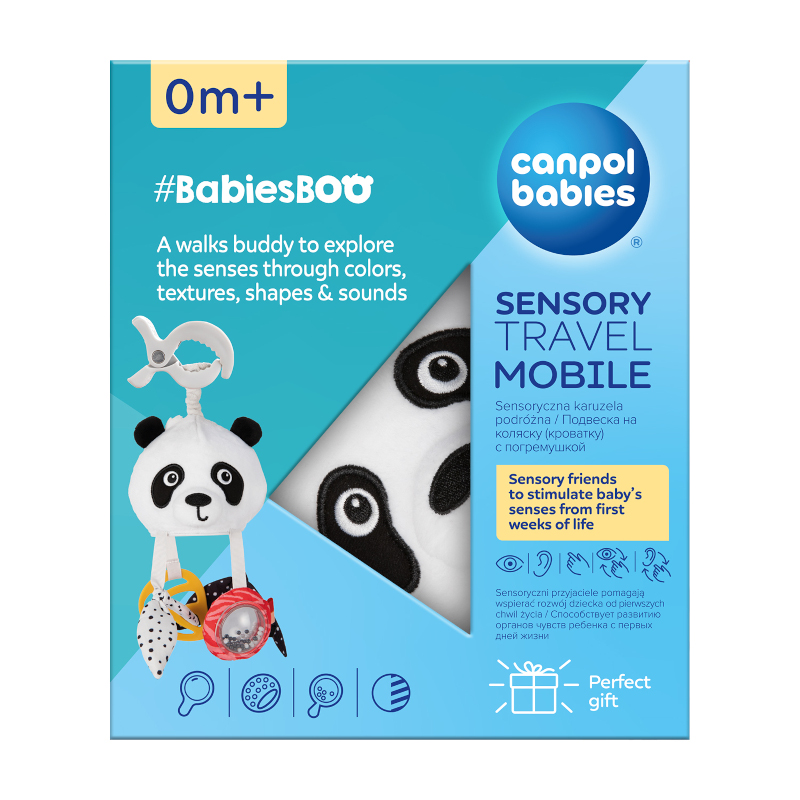 Ясно очертаното, контрастиращо лице на пандата, приятните дрънкалки, чесалката и голямото огледало ангажират детето и подпомагат развитието на сетивата му;