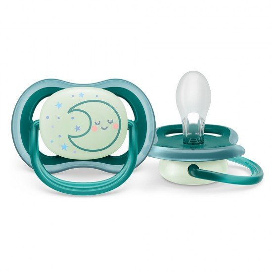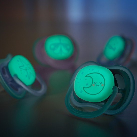 Комплект 2 бр. светещи в тъмното ортодонтични залъгалки Philips Avent Ultra Air Night 6-18м, сини с декорация Звезда и Луна, в кутия за стерилизиране и пренасяне