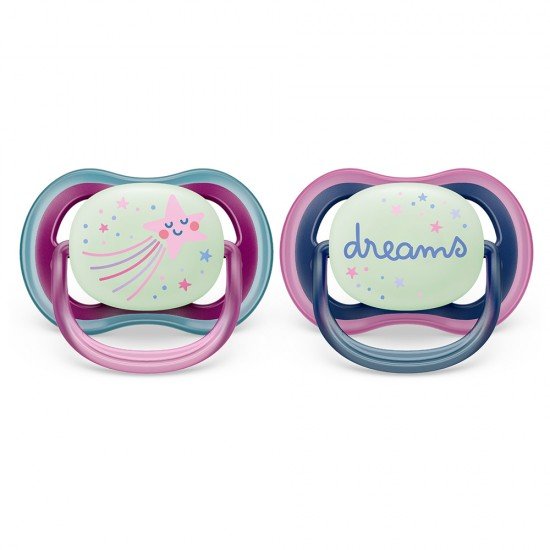 Комплект 2 бр. светещи в тъмното ортодонтични залъгалки Philips Avent Ultra Air Night 6-18м, розови с декорация Звезда и надпис Dreams, в кутия за стерилизиране и пренасяне
