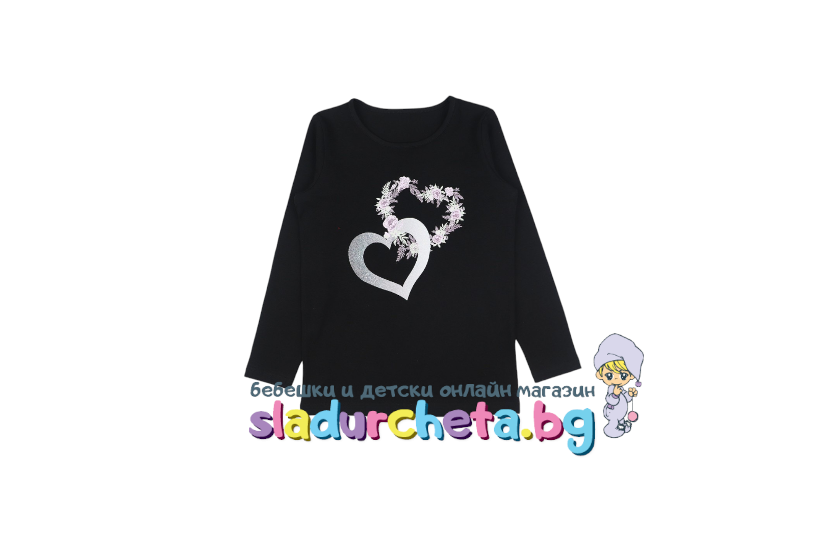 Блузата е с дълъг ръкав в черен цвят с акцент сърца в предната част;